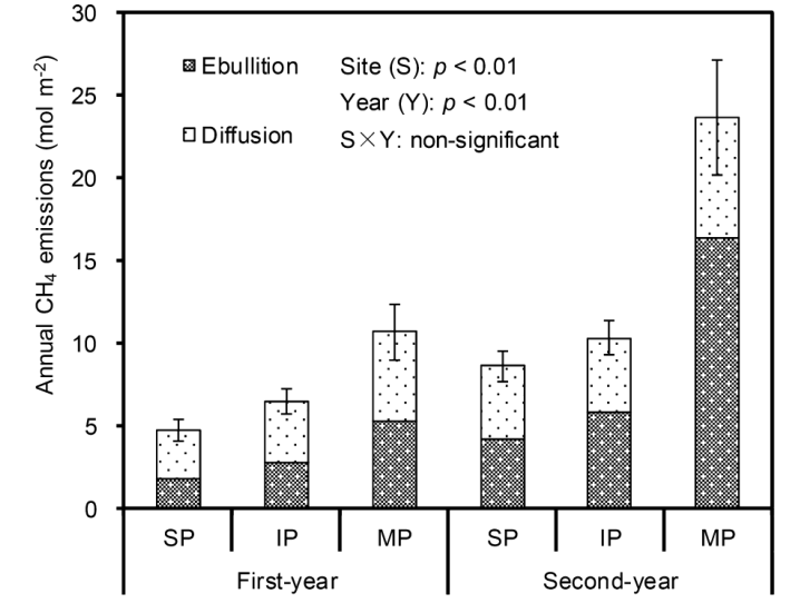 基于上述研究背景,在国家自然科学基金、973项目和人才项目等资助下,邹建文教授课题组采用箱法和扩散模型法相结合,对位于江苏省兴化市里下河地区一条灌溉稻田的运河支流开展为期两年的原位观测研究,并定量评估了扩散和汽包排放途径的相对贡献。研究结果明确了稻田灌溉河流CH4的年排放强度,表明灌溉河流是该流域CH4排放源的重要组成部分。其中,水稻生长季约占灌溉河流全年CH4排放总量的70%左右夏季气泡排放途径占总量的80%以上。发现稻田烤田排水在减少稻田CH4排放的同时增加了灌溉河流CH4排放。论文指出了以往局限在稻田烤田CH4减排的研究认识可能存在性片面性,并提出了稻田流域水体CH4的减排对策。这是邹建文教授课题组在该流域继淡水养殖湿地温室气体排放观测研究成果在Environmental Science & Technology5年影响因子7.25)上发文后取得的新成果。