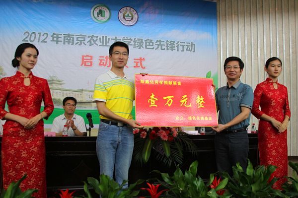 陆鑫达同学将其荣获的“Klaus Toepfer环境奖学金”(由前联合国副秘书长、前联合国环境规划署执行主任克劳斯·托普弗(Klaus Toepfer)教授在中国创立)一万元全额捐献给学校并设立绿色先锋基金,用于支持学生环保工作,表彰先进环保志愿者,李辉信代表电子竞技