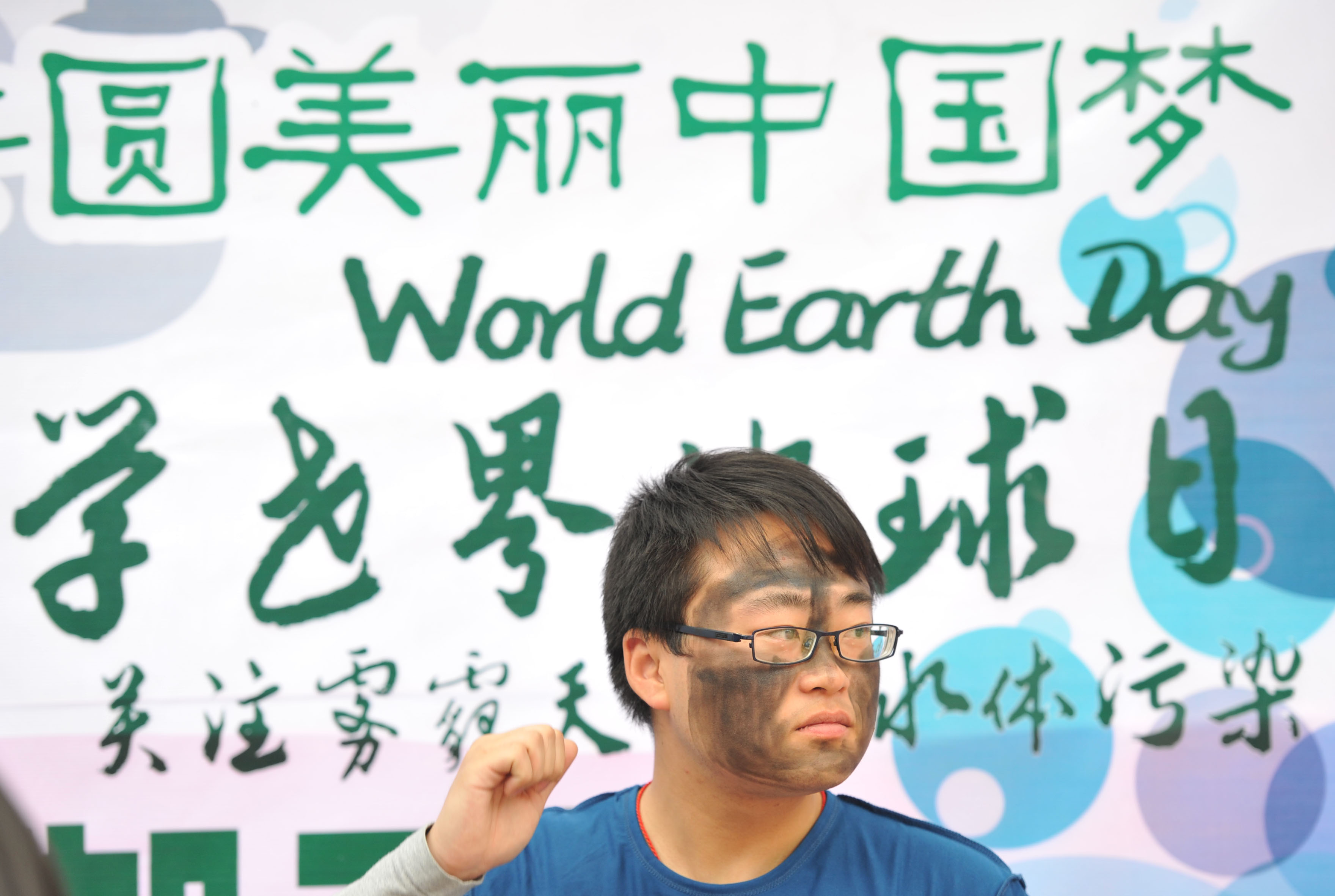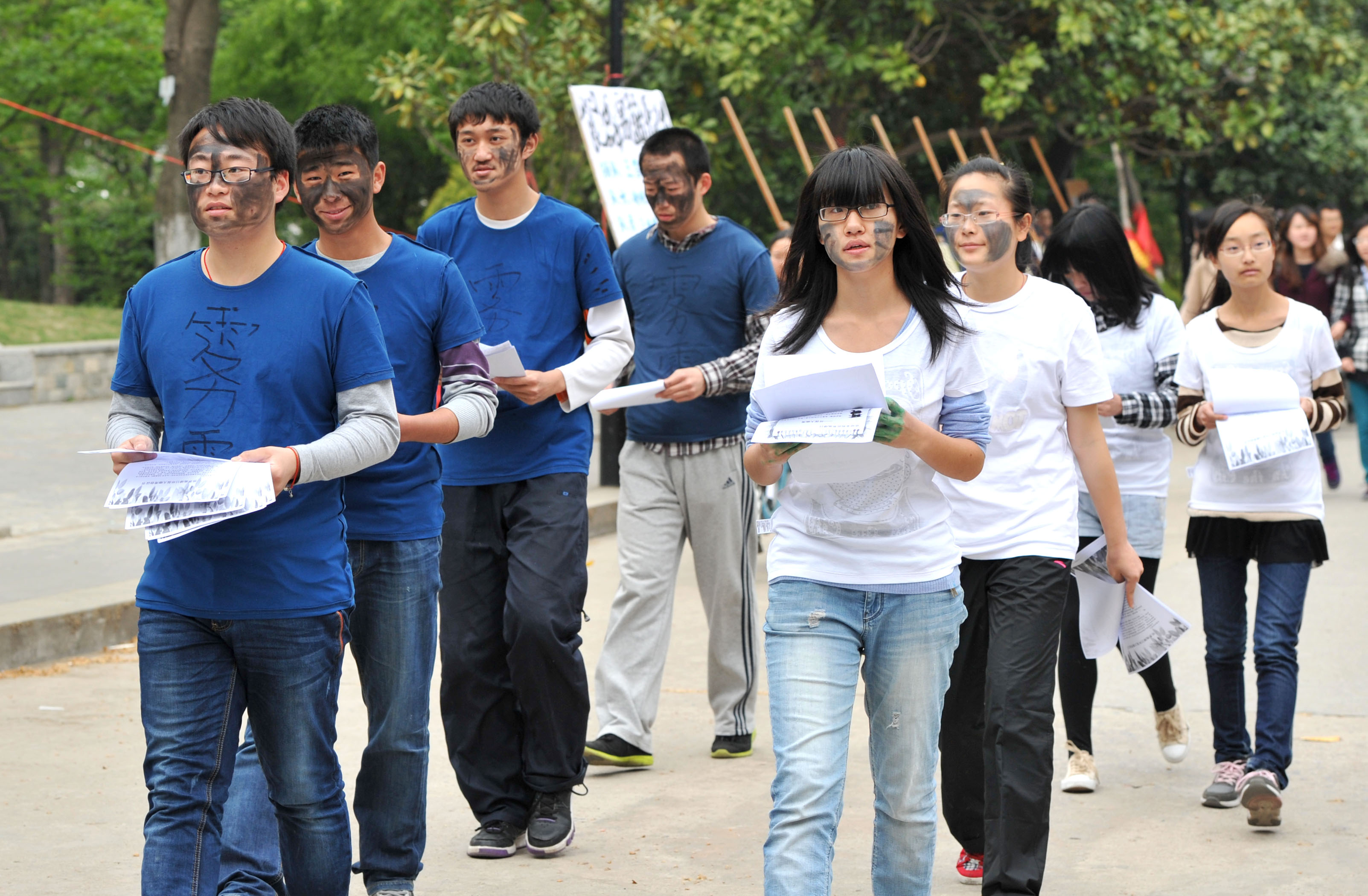 上午十一点,活动正式启动。八名志愿者分别穿着代表天空的蓝色上衣和代表水源的白色上衣,在脸和手臂上彩绘黑色及灰色图案,象征天空充满灰霾、水体已被污染的环境现状。志愿者们行走在教学楼、主楼、图书馆等校园标志性建筑之间,向过往同学发放环保倡议书和宣传单,呼吁大家关注空气污染、水污染等迫在眉睫的环境问题,认识到保护地球、保护环境的重要性。与此同时,电子竞技