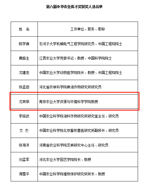 沈其荣教授被授予中华农业英才奖。