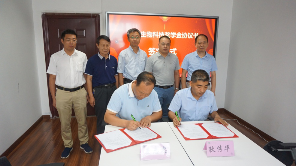 姜志忠、狄传华分别代表宏宝生物科技公司和学校签订奖学金捐赠协议。