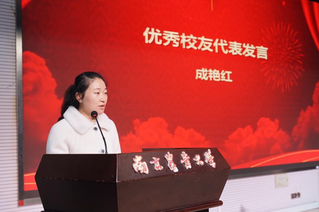 “全国巾帼建功标兵”、优秀校友代表成艳红发言。她回顾了在学校与师长同窗一同学习奋斗的时光,表达了对学校及学院的感谢。她表示优秀校友称号不仅是荣誉更是责任,在未来更需秉承“诚朴勤仁”的南农精神努力工作,同时借此平台促进交流,助推农业行业产学研的发展,为母校发展贡献力量。