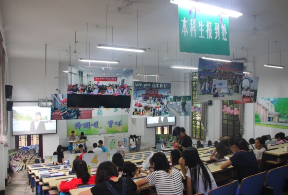 志愿者们从9月3日下午开始装扮迎新教室,迎新教室里挂满了资环学子生活掠影的展板,以期待给新同学展示电子竞技