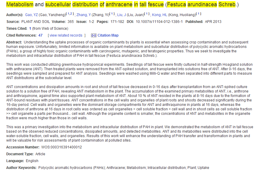 Metabolism and subcellular distribution of anthracene in tall fescue (Festuca arundinacea Schreb.)