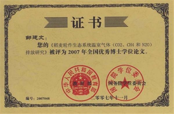 邹建文的博士论文(指导教师:黄耀教授)《稻麦轮作生态系统温室气体CO2、CH4和N2O排放研究》获2007年全国优秀博士学位论文