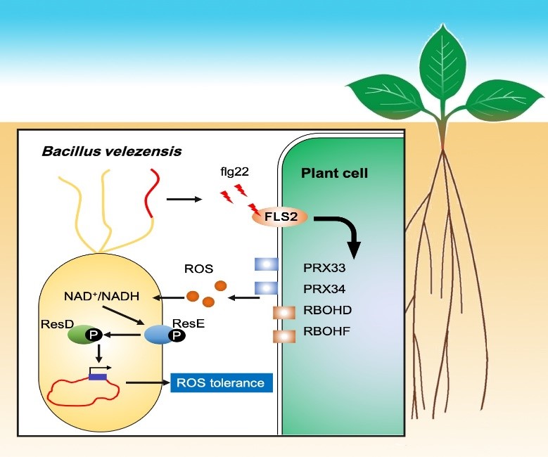 该研究表明,益生芽孢杆菌与病原细菌在应对植物活性氧爆发问题上采用了不同的策略,病原菌通过主动关闭或者逃逸植物的活性氧爆发,而益生芽孢杆菌由于其生活在根表而不侵染至根内,更倾向于耐受活性氧。该研究成果为肥料微生物定殖的调控提供了理论参考。