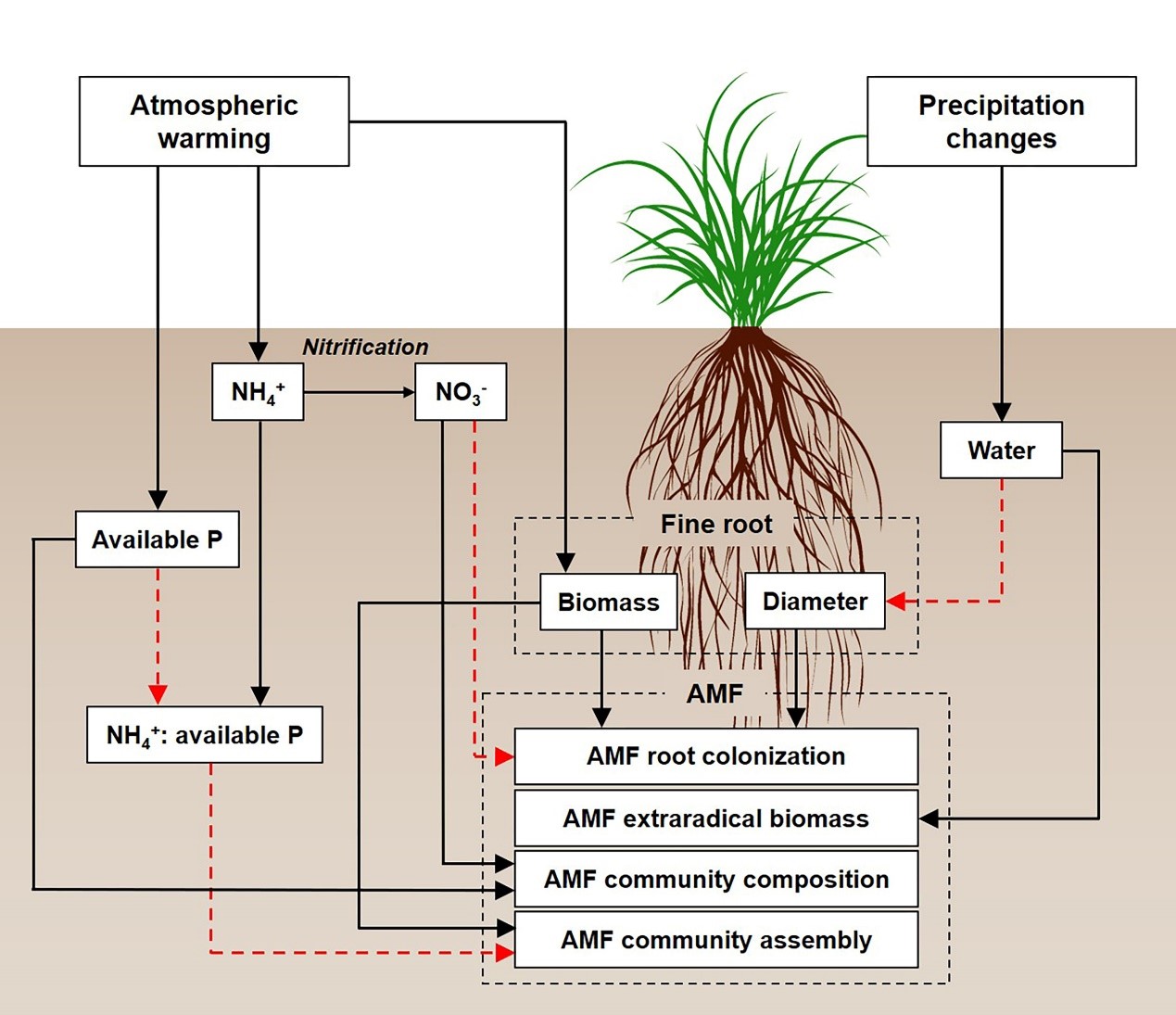 气候变暖和降水改变是全球变化的重要组成部分,可以显著影响植物生长与植物-微生物相互作用,尤其是植物与微生物的共生关系。丛枝菌根(AM)真菌是一类重要的植物共生微生物,在陆地生态系统中分布广泛并与80%以上的陆地植物根系形成共生体,其从寄主植物获得光合产物,并为植物提供营养作为交换。AM真菌在调节植物群落、根际微生物群落、土壤碳和养分循环等方面起着关键作用,特别是在养分循环受到温度限制的高寒地区,例如青藏高原草地生态系统, AM的作用尤为重要。因此, AM真菌群落对增温和降水改变的响应会对未来全球变化下植物群落动态和生态系统过程产生显著影响。然而,气候变暖和降水改变如何影响AM真菌群落构建尚不清楚。