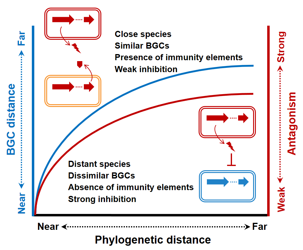 同一生境中的多种微生物之间通过营养竞争和拮抗竞争争夺空间与养分等资源。种间竞争作为一种重要的选择过程,是影响微生物群落装配与演替的关键因素。解析影响微生物种间竞争的驱动因子及其生物学机制,不仅是微生物生态学的重要科学问题,也能为利用微生物互作关系构建合成菌群提供理论依据。一般微生物间亲缘关系越近,营养竞争也越激烈,但菌株间拮抗强度与遗传距离的关系及相关驱动机制尚存在诸多争议。