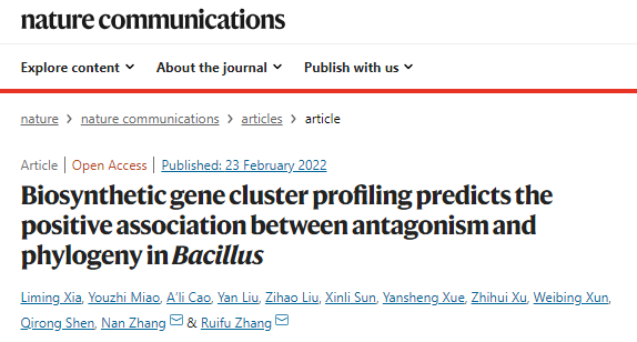 近日,国际著名综合性期刊《Nature Communications》正式刊出了沈其荣院士团队张瑞福教授课题组的最新研究成果“Biosynthetic gene cluster profiling predicts the positive association between antagonism and phylogeny in Bacillus”。该研究首先基于芽孢杆菌属4000多个全基因组的比较分析发现菌株间次级代谢产物生物合成基因簇(biosynthetic gene clusters, BGCs;包含部分自我免疫基因)的分布特征与其系统发育关系呈现一致性,即遗传距离较近的种属倾向于共享更多的BGCs。随后通过拮抗实验发现代表性芽孢杆菌之间的拮抗强度与菌株间的遗传距离和BGC距离均呈显著正相关,特别对于含BGC数量较多的菌株该规律更加明显。最后通过突变体实验证明典型根际有益芽孢杆菌SQR9对不同芽孢杆菌的抑制作用均来源于拮抗菌特有、而靶标菌缺失的BGC,两菌共有的BGC则不发挥抑制作用。综上所述,本研究揭示在芽孢杆菌属内,次级代谢产物合成基因簇(含自我免疫基因)分布与系统发育的一致性驱动了菌株间拮抗强度与遗传距离的正相关关系。该成果不仅解释了达尔文在《物种起源》中提出的物种竞争与亲缘性之间关系的重要生态学问题,同时可为理性设计生物肥料中的合成菌群提供理论依据。