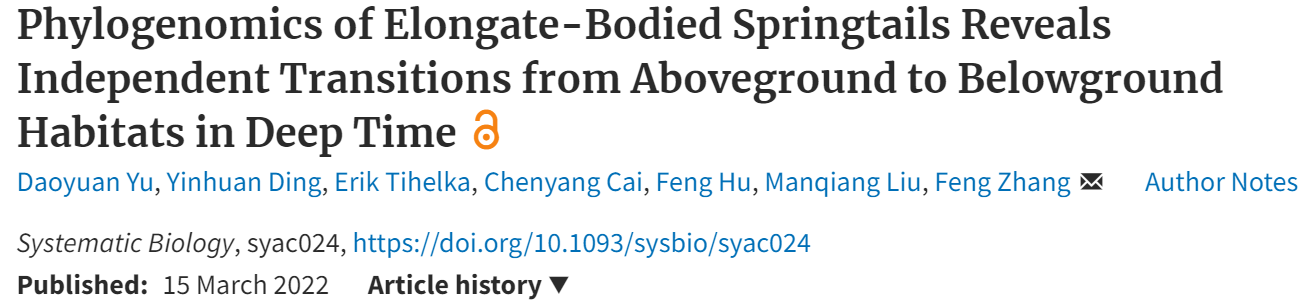 近日,国际演化生物学顶级期刊Systematic Biology在线刊登了题为“Phylogenomics of Elongate-Bodied Springtails Reveals Independent Transitions from Aboveground to Belowground Habitats in Deep-Time”的研究论文。该研究由电子竞技