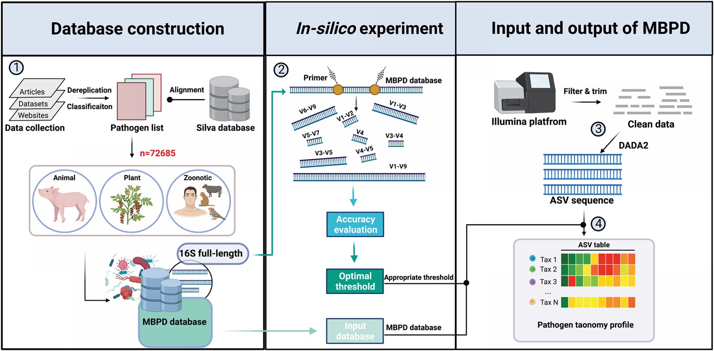 病原细菌是威胁人类健康与生态安全的重要生物污染因子之一。然而,当前依然缺乏针对引发动物、植物、人畜共患病的病原细菌高通量快速检测的技术体系。为此,LorMe实验室创建了基于16S扩增子测序的多病原检测系统MBPD,可一次性实现近上千种病原细菌的检测。该研究构建了较为完整的病原细菌数据库,囊括近2000种、72,685条引发动植物和人类感染的病原细菌信息。通过虚拟试验评估了16S不同扩增子区域对检测效果的影响,优化配置了系统参数,提升了检测效率及准确率。生物与环境土壤样品分析结果表明,MBPD不仅能直接检测出引发人类、动物和植物病害的主要致病菌,还能识别复合感染的病原菌。该研究将为我国环境土壤生物健康普查,以及农业、兽医、医药和环境病原菌的风险监测与预防等提供重要参考依据和技术手段。