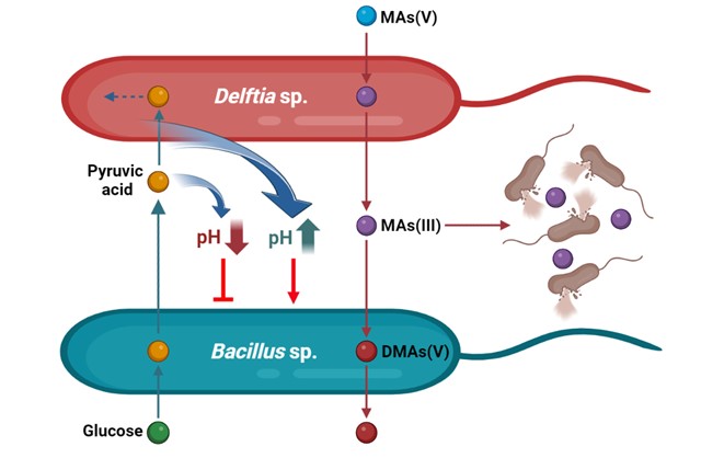 图3. Bacillus sp.和Delftia sp.在碳代谢和砷转化中的交叉互养相互作用模型