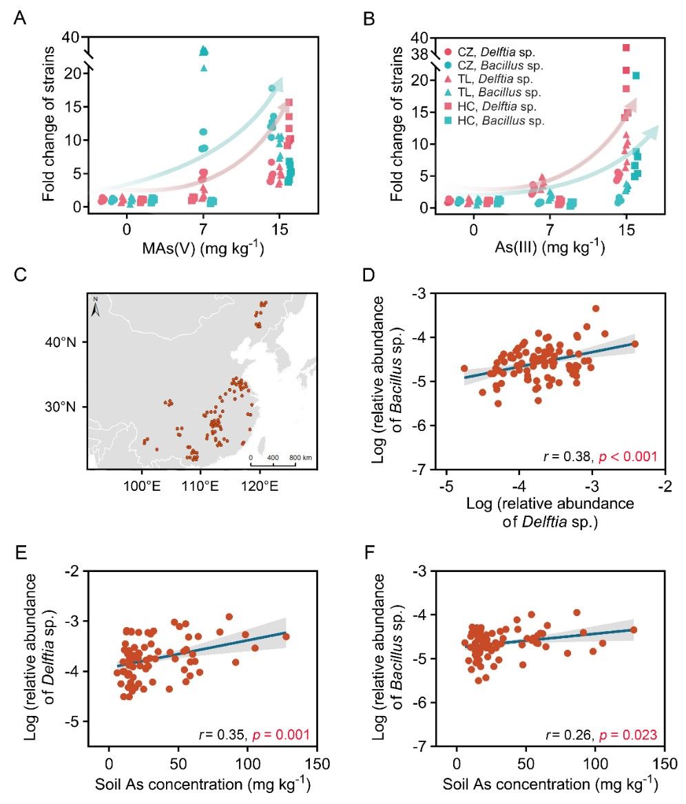 图2. 土壤中Delftia sp.和Bacillus sp.之间依赖于砷浓度的合作关系很常见。(A,B)添加不同浓度的MAs(V)或As(III)的土壤中Delftia sp.和Bacillus sp.的相对丰度变化;(C)从不同气候带收集的103个土壤样本分布;(D)Delftia sp.和Bacillus sp.的相对丰度之间的相关性;(E,F)Delftia sp.和Bacillus sp.的相对丰度与土壤砷浓度的相关性
