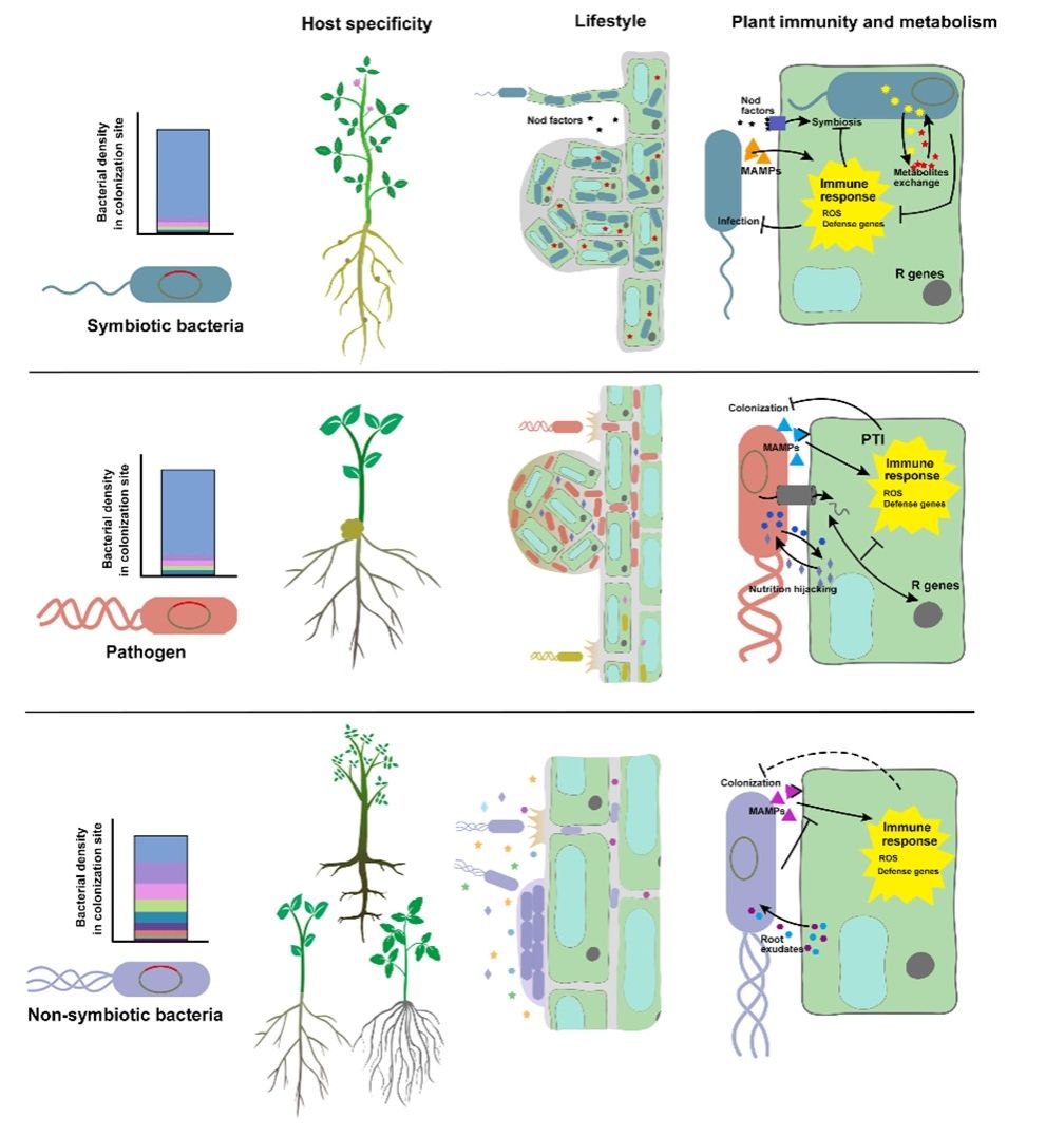 根际益生菌对植物的健康和生长具有重要意义,能够开发为微生物肥料生产菌种支撑农业绿色发展。与植物土传病原菌和植物共生菌(比如根瘤菌和菌根真菌)两类典型植物微生物相比,作为农用微生物制剂生产的主力军、同样与植物紧密互作但不形成共生体系的根际益生菌与植物的互作过程和根际定殖机制研究还不够深入。张瑞福教授课题组长期从事以芽孢杆菌为代表的非共生植物益生菌与植物的互作研究,近日,受邀在微生物学顶级综述期刊《欧洲微生物学会联盟·微生物学综述(FEMS Microbiology Reviews)》(IF5=17.7)发表长篇综述文章,系统总结植物益生菌的根系定殖机制并与植物土传病原菌和植物共生菌的根际过程进行比较,以期为提高根际益生菌为主的微生物肥料根际定殖能力和应用效果稳定性提供理论指导。