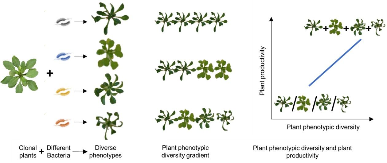 生物多样性与群落生产力的关系及其驱动机制一直是生态学领域的研究热点。在自然生态系统中,植物遗传多样性可增加其群落生产力,可能受群落多样性水平(多样性效应),关键植物类型(抽样效应)及其之间的协同作用(超产效应)等生态关系的影响。同时,土壤中微生物多样性及其释放的关键代谢物(如VOCs)在植物生产力调控中也发挥了重要作用。然而,当前的农业种植模式具有密度高、类型单一等特点,导致农田系统的植物多样性较低,影响作物生产力的提高。因此,利用微生物多样性从而提高农田生态系统多样性,为提高农田作物生产力提供可能。本研究从微生物VOCs对植物表型的影响出发,通过模拟植物遗传多样性塑造表型多样性,探究微生物VOCs介导的植物表型多样性规律及其对作物群落生产力的影响,为研究生物多样性与群落生产力提供了新的角度。