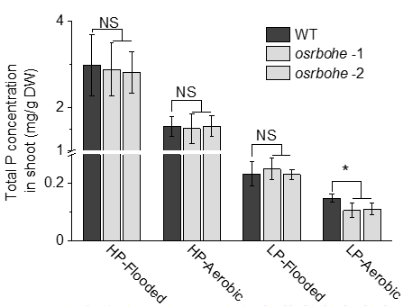 为了评估根毛在水稻磷获取中的作用,设置了高、低磷土壤淹水和旱作四种处理。野生型和osrbohe株系在低磷土壤淹水或旱作条件下严重缺磷,生长受阻。在低磷土壤且旱作条件下,osrbohe株系的地上部磷浓度和磷积累量均显著低于野生型,而在低磷土壤淹水和高磷土壤淹水或旱作条件下,野生型和osrbohe株系地上部磷浓度和磷积累量均无显著差异(图2),表明水稻根毛只在低磷土壤旱作条件下对磷的获取起作用。
