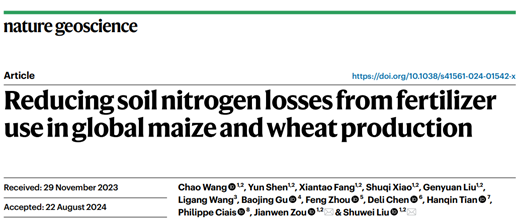邹建文教授团队题为“Reducing soil nitrogen losses from fertilizer use in global maize and wheat production”的研究长文(article)。该研究建立了全球尺度上高精度的玉米和小麦生产氮肥施用引起的土壤活性氮(Nr)损失清单,并为优化田间管理措施减少土壤Nr损失提供了新的见解。