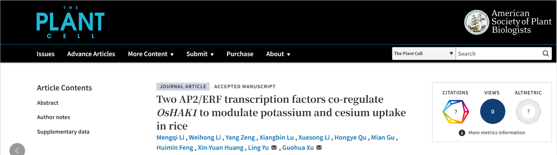徐国华教授团队在植物学顶级期刊《The Plant Cell》在线发表了题为“Two AP2/ERF transcription factors co-regulate OsHAK1 to modulate potassium and cesium uptake in rice”的研究论文。该研究首次揭示了一对功能相互拮抗的AP2/ERF转录因子通过协同调控OsHAK1的表达,动态平衡水稻对钾和铯的吸收过程。