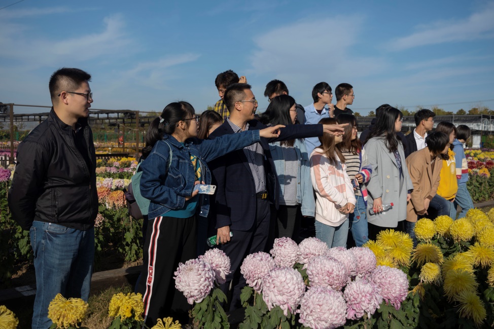 抵达湖熟基地,陈发棣带领同学们走进菊花温室,向同学们逐一介绍丰富的形态各异的菊花品种:“南农极点”“南农紫乒乓”“南农白蝴蝶”……这些由南农培育出的菊花品种深深吸引住同学们的眼球。随后,他又介绍说,学校许多菊花品种都得到了大范围的推广应用,尤其是在带动地区菊花食品加工、观光旅游、产业扶贫等方面发挥了重要作用,为地方经济社会发展作出了重要贡献。我校菊花等产业助力麻江扶贫工作也入选部属高校精准扶贫精准脱贫十大典型项目。班上的留学生思塔希感慨到:“陈老师介绍的这些菊花真的惊(艳)到我了,我也想把南农美丽的菊花带到我的家乡。”